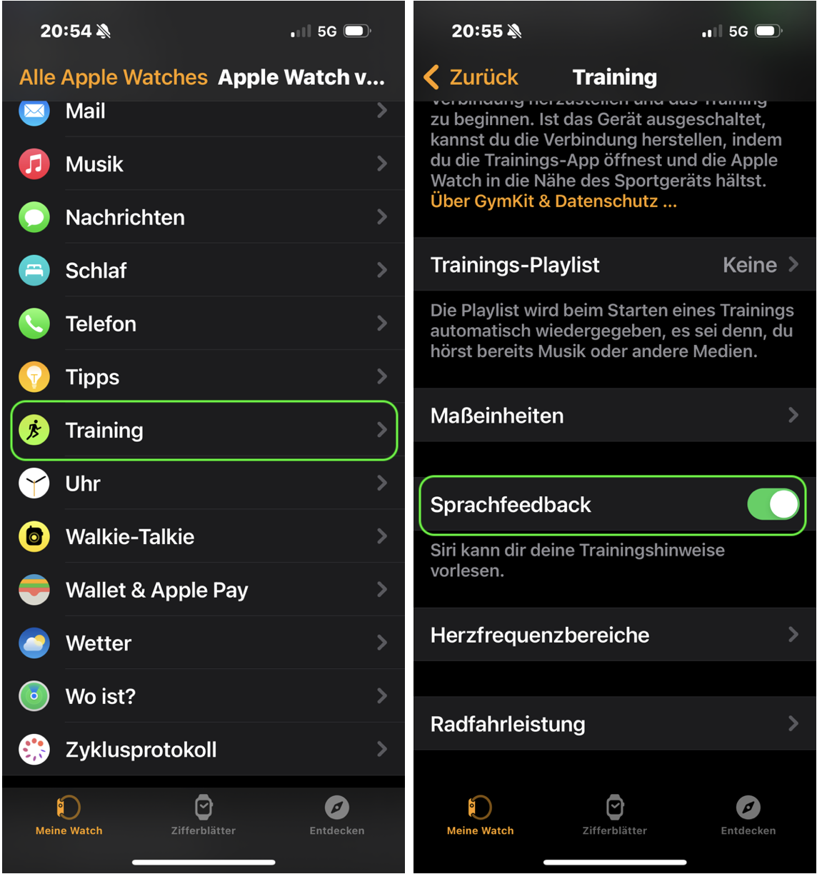 Hallo Lechos, ich vermute mal, du meinst das Sprachfeedback während eines Trainings. Hast du schon diesen Weg versucht? Öffne bitte die Watch App auf deinem iPhone
