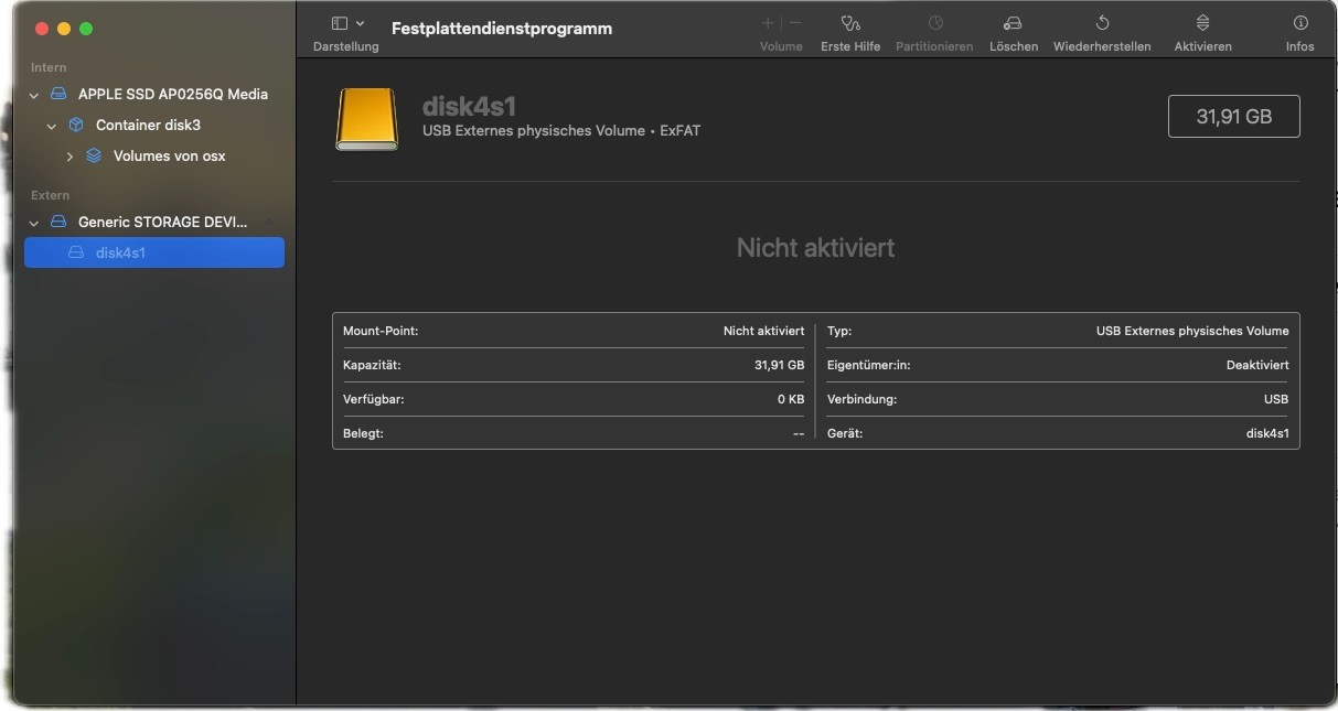 Die Speicherkarte wird im Finder nicht angezeigt, im Festplattendienstprogramm aber schon. Dort wird die Karte als "Nicht Aktiv" angezeigt. Eine Aktivierung ist nicht möglich, Wiederherstellen bringt auch nichts.