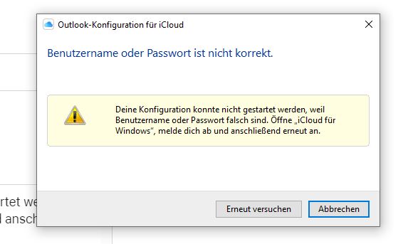 Dann kam oben genannte Fehlermeldung ergänzt mit "Deine Konfiguration konnte nicht gestartet werden, weil Benutzername oder Passwort falsch sind. Öffne "iCloud für Windows", melde Dich ab und anschließend erneut an."