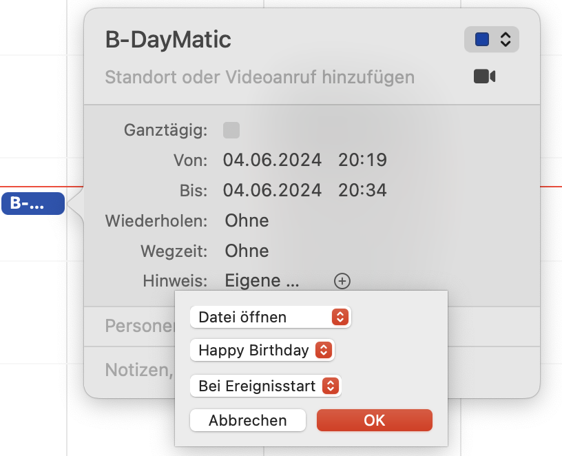 Dann im Kalender ein sich täglich wiederholendes Ereignis anlegen (hier "B-DayMatic")