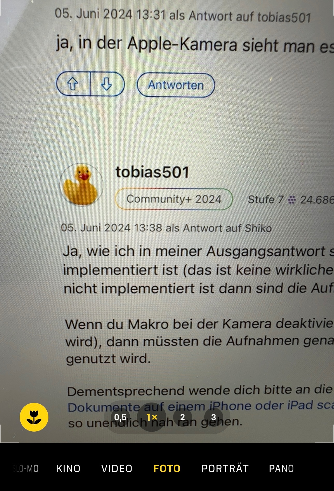Hallo. Ich habe ein iPhone 15 Pro. Nutze ich die Kamera in Drittanbieter-Apps - z.B. zum Abscannen eines QR-Codes oder einer Visitenkarte o.ä. - kann ich die Kamera nicht richtig verwenden. Die Kamera stellt das Bild nicht scharf. Wechsle ich in die normale Apple-Kamera-App, passt er den Fokus an und die Details sind scharfgestellt. Woran liegt das?