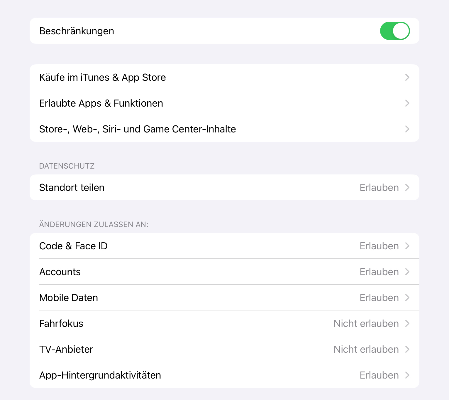 Wo liegt der Fehler in meinen Einstellungen, das wenn Beschränkungen greifen / eingeschaltet sind auf dem Kinder-Tablet oder Iphone der Apple App Store nicht zugänglich ist?