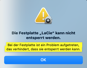 Mein MacBook Air –– läuft stets mit der neusten macOS-Version, gegenwärtig mit Sonoma 14.5 –– machte via Time Machine täglich automatisch ein Backup auf die externe Festplatte LaCie (1 TB). Nun ist diese ext. Festplatte ausgestiegen, d.h. das Symbol (Icon) der ext. Festplatte auf dem Schreibtisch ist verschwunden, dafür wird jetzt die folg. Meldung angezeigt: