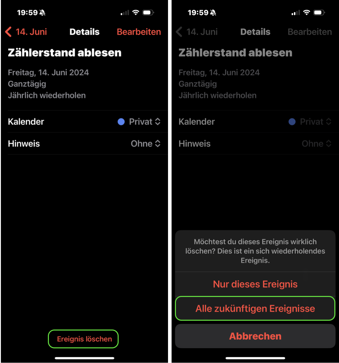 Im Folgefenster kannst du wählen, ob du nur das aktuelle Ereignis oder alle zukünftigen Ereignisse löschen möchtest.