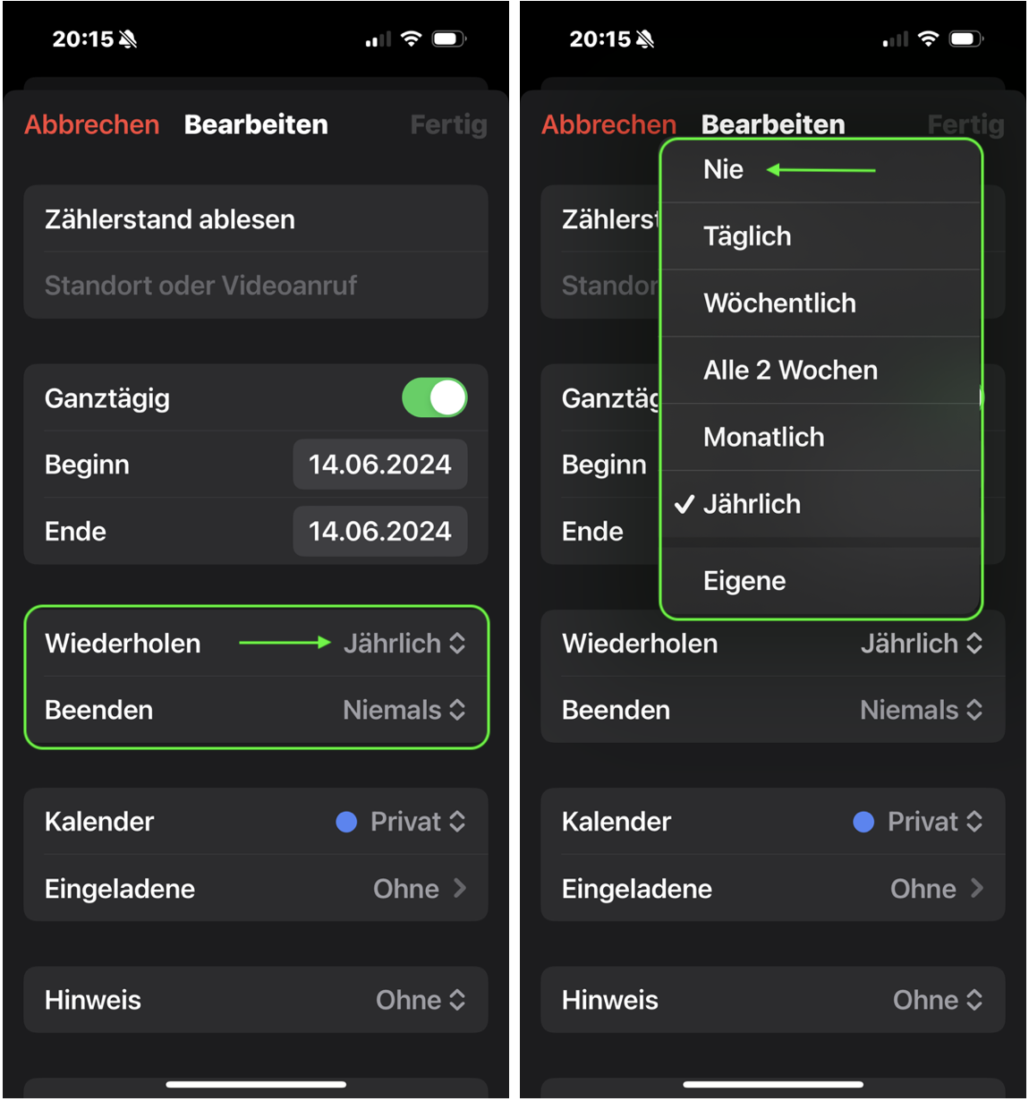 Tippe auf "Wiederholen" und stelle im angezeigten Fenster (Bild rechts) die gewünschte Zeit bzw. "Nie" ein. Wie von Netcracker vorgeschlagen, kannst du auch den Termin komplett löschen.