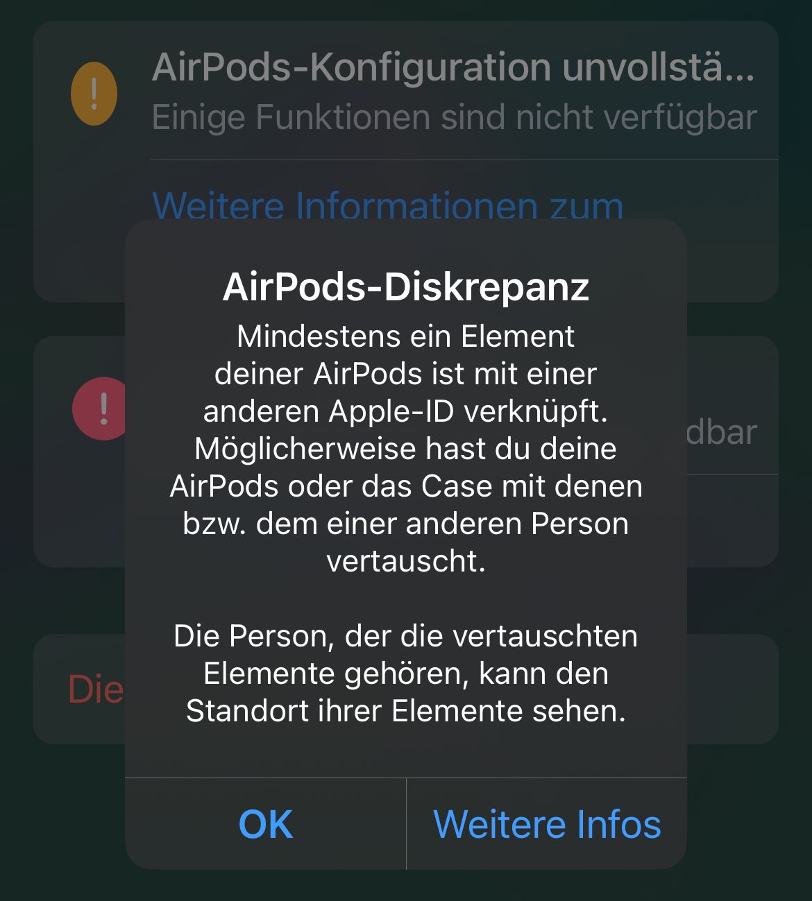 Letztes Jahr habe ich AirPods Pro (2. Generation) gefunden und sie an der Fundstelle abgegeben. Vor kurzem habe ich sie zurückbekommen, weil der Besitzer nicht ausfindig gemacht werden konnte. Die AirPods sind sozusagen nun in meinen Besitz übergewandert, jedoch kann ich nicht alle Funktionen nutzen. Der Grund ist, dass die Apple-ID des Vorbesitzers nicht entfernt wurde. Deshalb funktioniert die "Wo ist" Funktion nicht, wie auf dem Foto zu sehen ist.