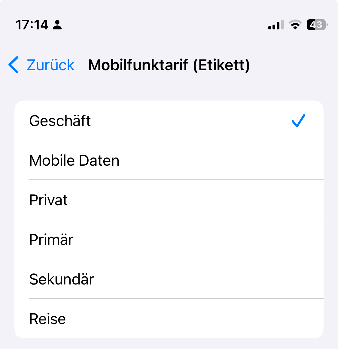 - beim einrichten hatte ich ausversehen die Mobilfunktarif Etiketten vertauscht. Jetzt hat die private Nummer das Etikett „geschäftlich“ und es lässt sich einfach nicht ändern. Bei der eSim hingegen lässt es sich problemlos ändern.