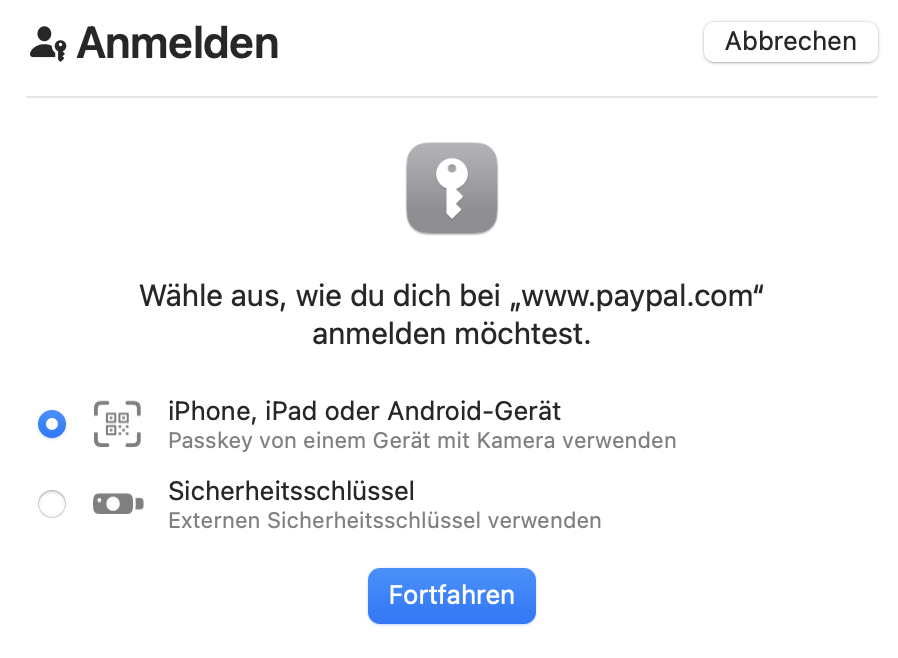 in letzter Zeit erhalte ich bei Webseiten, z.B. bei PayPal, ein neues Pop-up, das von Safari geöffnet wird. Es scheint ein natives Pop-up zu sein und nicht von Drittanbietern. Ein Screenshot ist beigefügt. Darin wird man gefragt, wie man sich anmelden möchte. Ich muss dieses Fenster immer anklicken, da keine der beiden Optionen zutreffen. Was hat es mit diesem Hinweis auf sich und wie kann ich es deaktivieren?