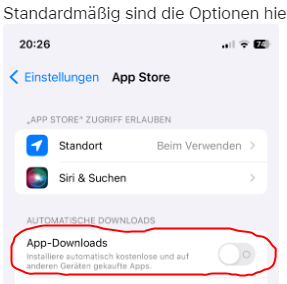 Ich weiß, wie das theoretisch geht, aber in den Einstellungen des App Stores fehlt komplett der Unterpunkt Automatische Downloads.