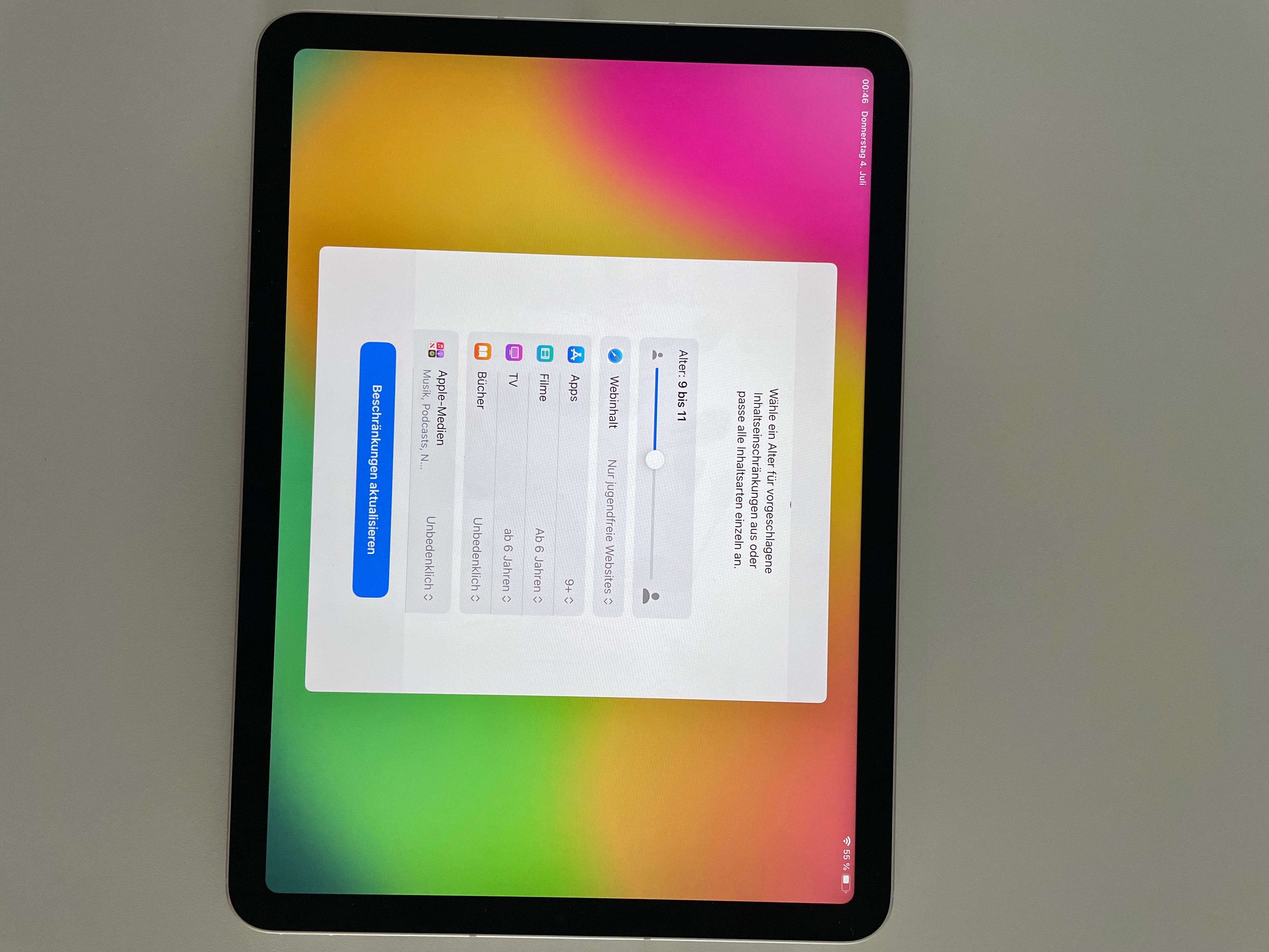 Habe für meinen Sohn einen Apple Account auf einem neuen IPad Air als Kinderaccount eingerichtet, alles hat funktioniert bis zum letzten Schritt: Auf welche Inhalte darf XY zugreifen? Hier tippe ich auf „Beschränkungen aktualisieren“ und es passiert nichts weiter. Es geht nicht weiter, aber auch nicht zurück