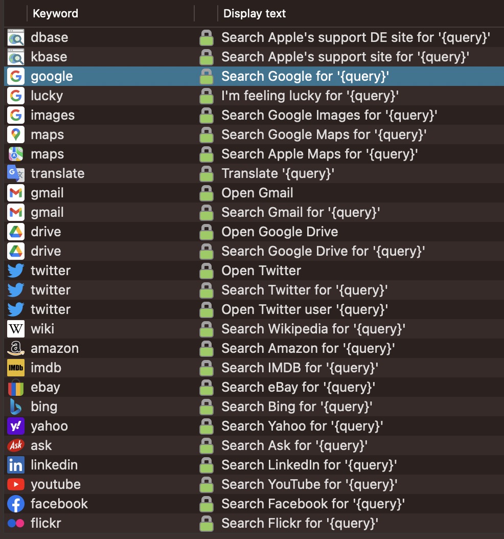 Eine weitere Variante möchte ich Dir mit der App Alfred, aus dem Kreise der Insider / der fortgeschrittenen Anwender, nicht vorenthalten, so kannst du nicht nur eigene aber auch selbsterstellte Keywords für unterschiedliche Anliegen nutzen.