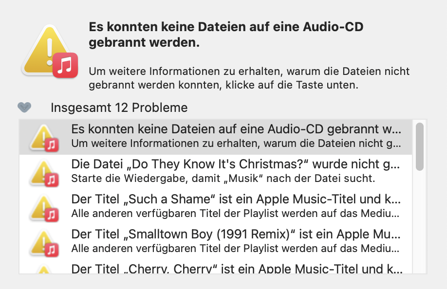 um das Problem mit dem Brennen von Musik auf eine CD zu lösen, stelle sicher, dass alle Titel verfügbar sind und keine Apple Music-Titel sind, da diese aufgrund von DRM nicht gebrannt werden können.