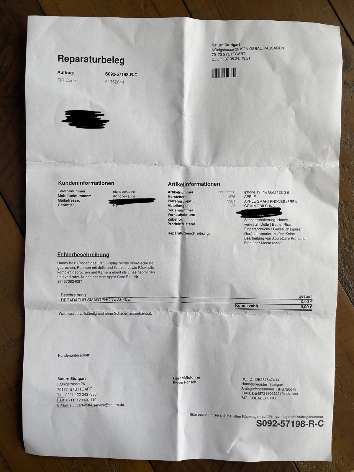 Ich habe letzte Woche mein IPhone 12 pro das Apple care + hat beim Saturn in Stuttgart abgeben, da Display und Rückseite bei einem Sturz gebrochen sind. Es wurde angenommen und der ganze Vorgang abgewickelt. Knapp eine Woche später bekomme ich die Nachricht das ich das Gerät wieder abholen kann. Als ich dort ankomme bekomme ich das immer noch kaputte IPhone zurück, mit der Aussage "MediaMarkt/Saturn repariere keine Apple Care+ Produkte mehr". Allerdings findet man auf der Apple Homepage alle Media/Saturn Märkte als Service Points hierfür markiert. Musste nun ein Termin in Sindelfingen machen, dass mit den Öffis 1 Stunde entfernt liegt.