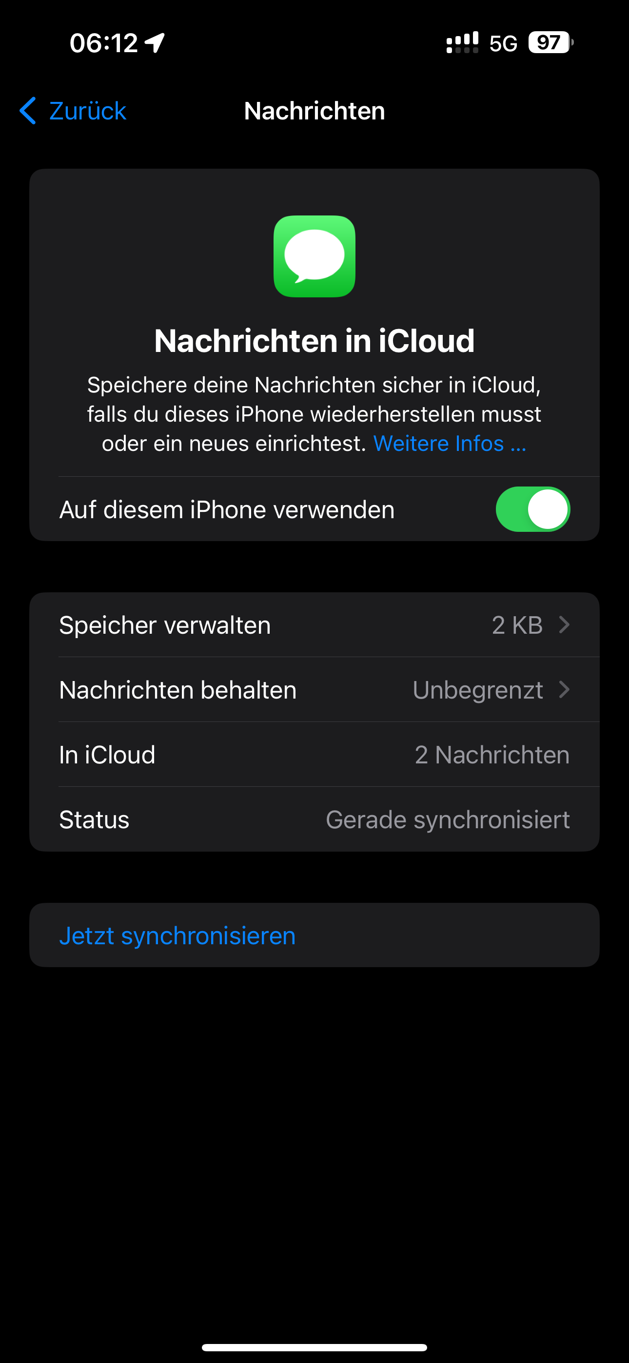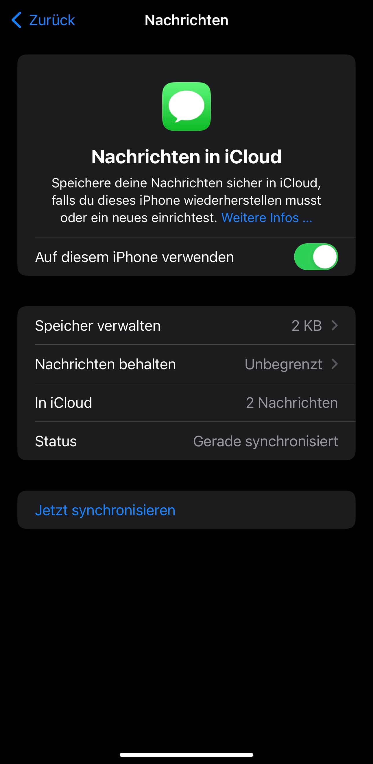 - Egal wie lange ich warte, oder auch Nachrichten in der Cloud für mehr als 30 Tage deaktiviere (auf allen Geräten), die Anzahl der Nachrichten ist nie 0 sondern IMMER 2 -> solange keine Nachrichten eintreffen, dann passt es wieder mit der Anzahl
