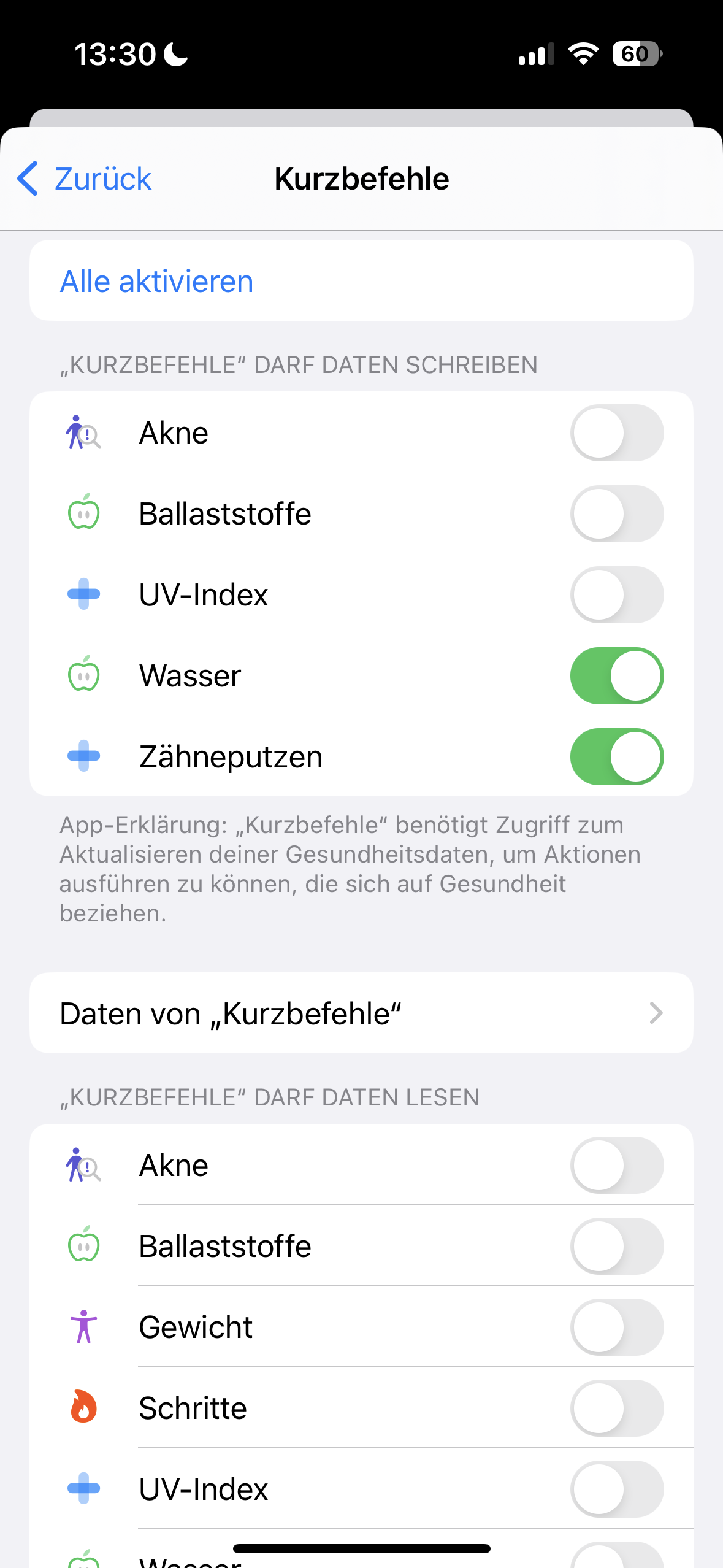 Tippe dann in der App „Health“ auf dein Profilbild und gehe dort auf „Apps und Dienste“, dann auf „Kurzbefehle“ und dort kannst du dann die Erlaubnis erteilen, dass Kurzbefehle auch Daten hinzufügen darf (schreiben)