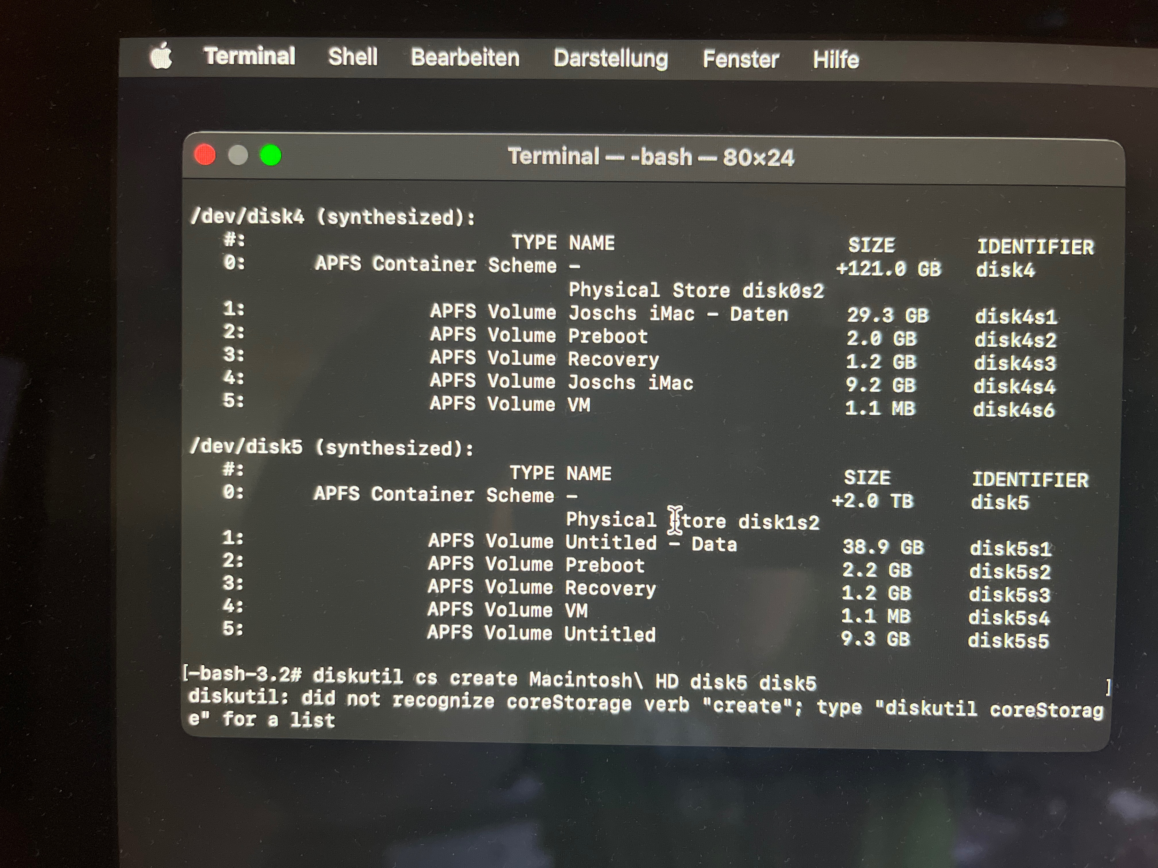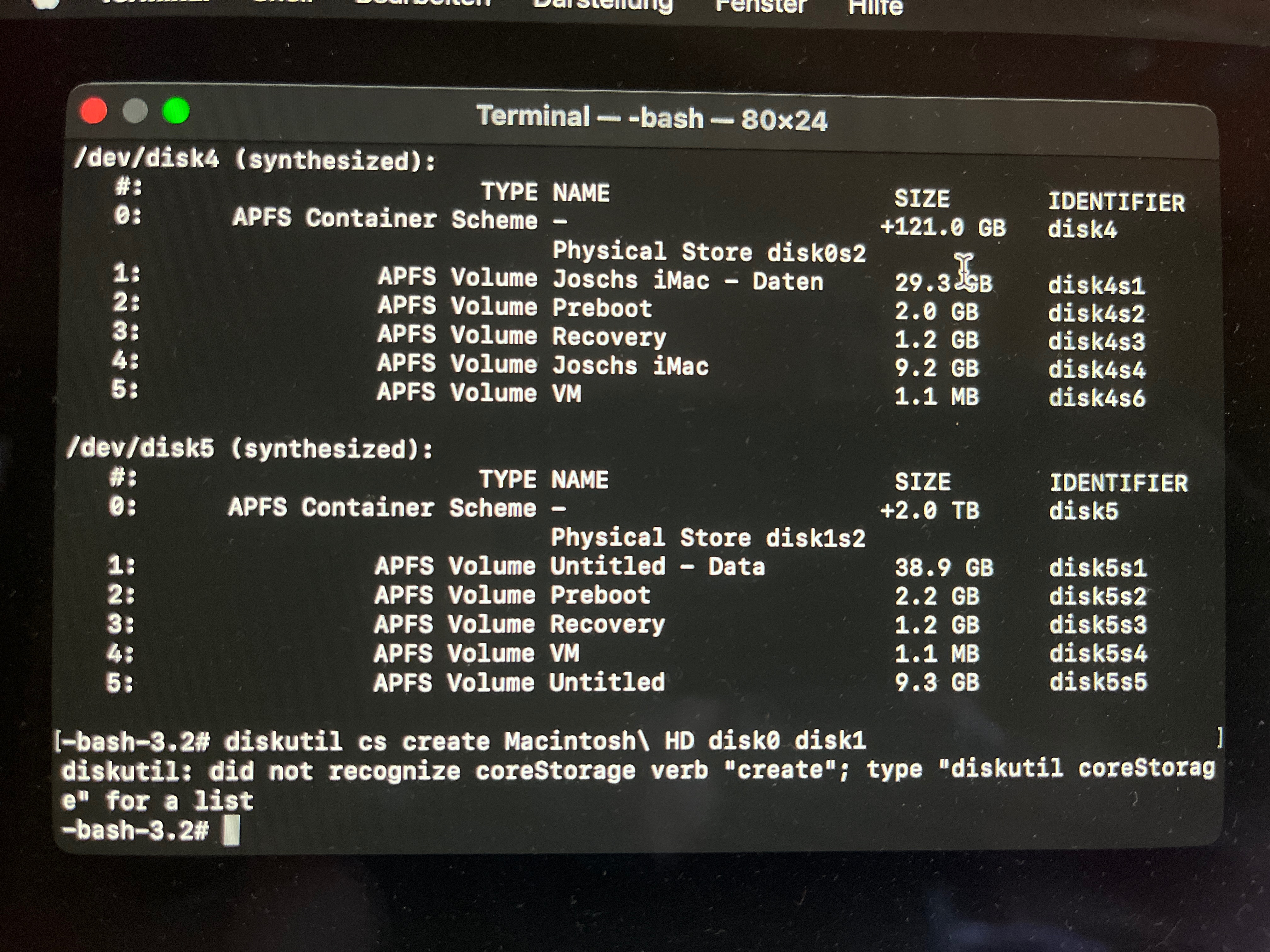 Und der Befehl „Diskutil CS Create Macintosh\ HD Disk0 Disk1“ funktioniert nicht. Oder habe ich hier was falsches eingegeben?