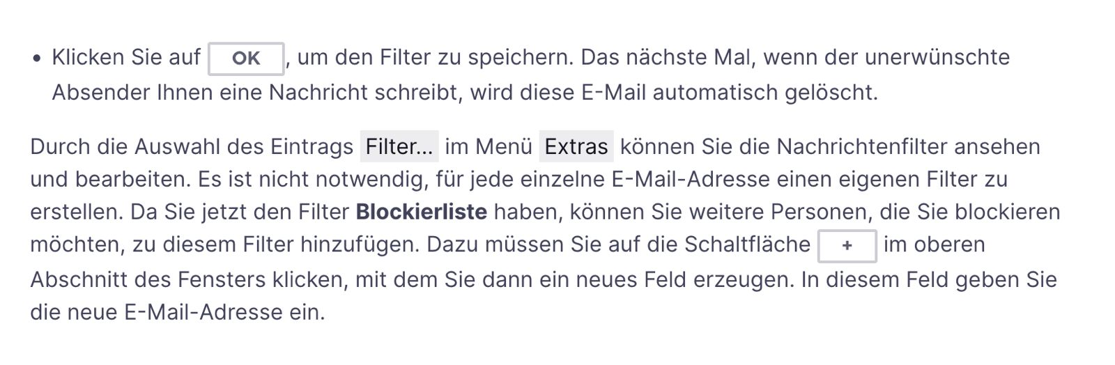 Alternativ könntest Du alle Junk-Mails, die Du blockieren möchtest, in einen temporären Ordner verschieben. Schließe dann das Filter-Fenster, kopiere die E-Mail-Adressen aus diesem Ordner in Deinen Texteditor und füge sie anschließend in das Filter-Fenster ein.