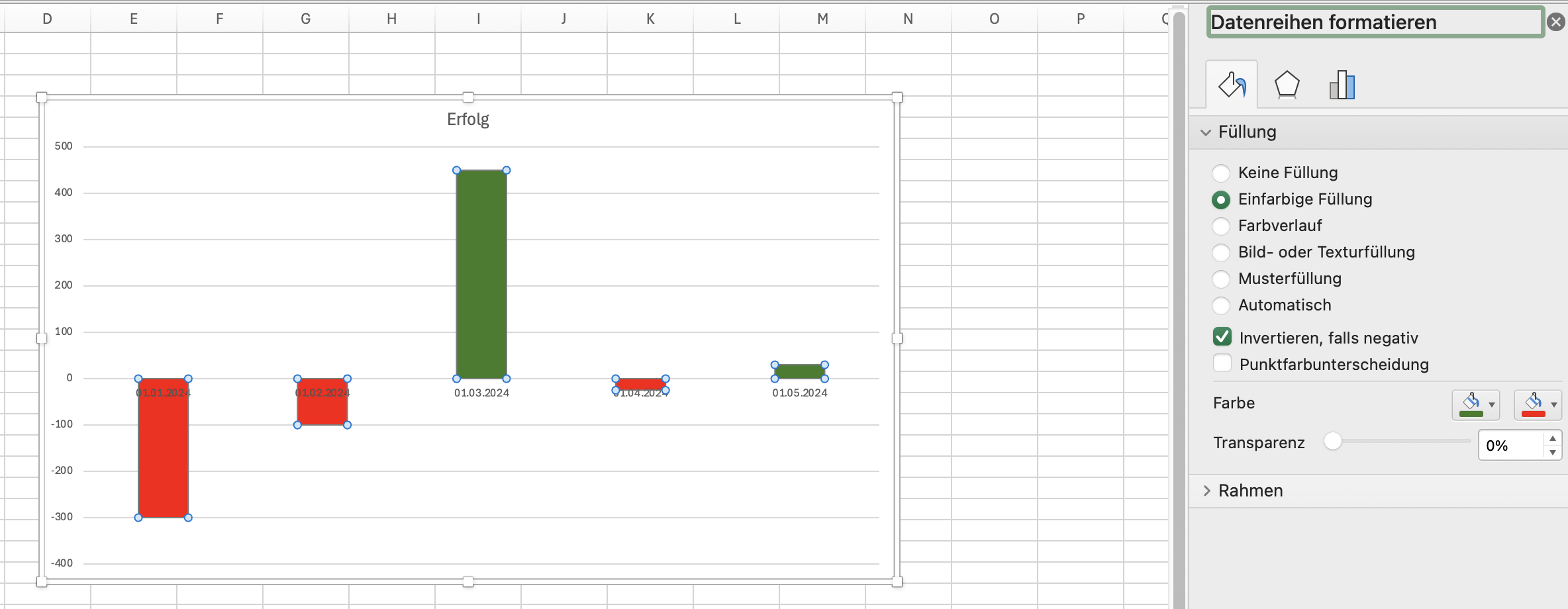 Die Erstellung eines Säulen- oder Balkendiagramms ist wirklich keine Hexerei. Meine Anforderung jedoch ist es, negative Zahlen (also Verluste) mit roten Balken und positive Zahlen (also Gewinne) mit grünen Balken darzustellen.