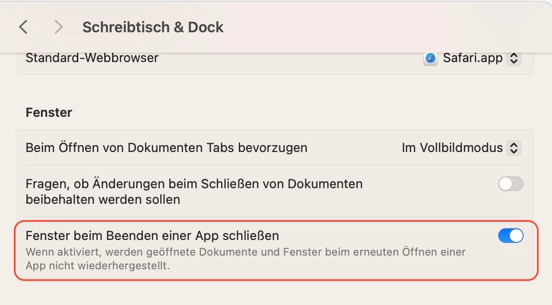 Gehe zu „Systemeinstellungen“ > „Allgemein“ und stelle sicher, dass die Option „Fenster beim Beenden einer App schließen“ nicht aktiviert ist. Wenn diese Option aktiviert ist, wird Safari die Fenster der letzten Sitzung nicht speichern.