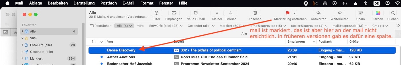 mac mini 2018, Sonoma 14.6.1, mail 16.0, markierungen nicht sichtbar bei spaltendarstellung
