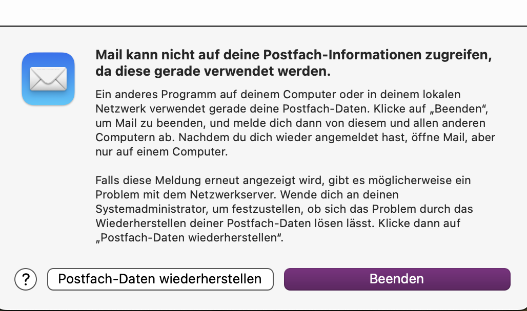Hallo, bei unserem iMac (2017 Retina 4K, 21,5") kommt seit dem Update auf Ventura (aktuell 13.6.9), beim Starten von Mail, nicht immer, aber leider immer häufiger die Meldung: "Mail kann nicht auf deine Postfach-Informationen zugreifen, da diese gerade verwendet werden". Bisher haben wir immer Mail beendet, den Mac neugestartet und gehofft, dass es normal läuft. Braucht manchmal ein paar Durchgänge.