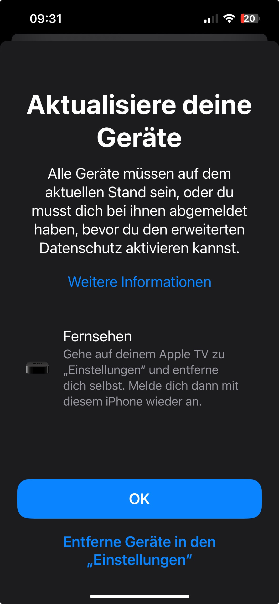 Nun möchte ich unter Einstellungen - Apple-ID - Icloud den Erweiterter Datenschutz aktivieren. Den Wiederherstellungsschlüssel habe ich mir schon erstellt. Wenn ich dort nun auf Erweiterter Datenschutz aktivieren klicke kommt folgende Meldung: Aktualisiere Deine Geräte bzw. Melde dich ab.