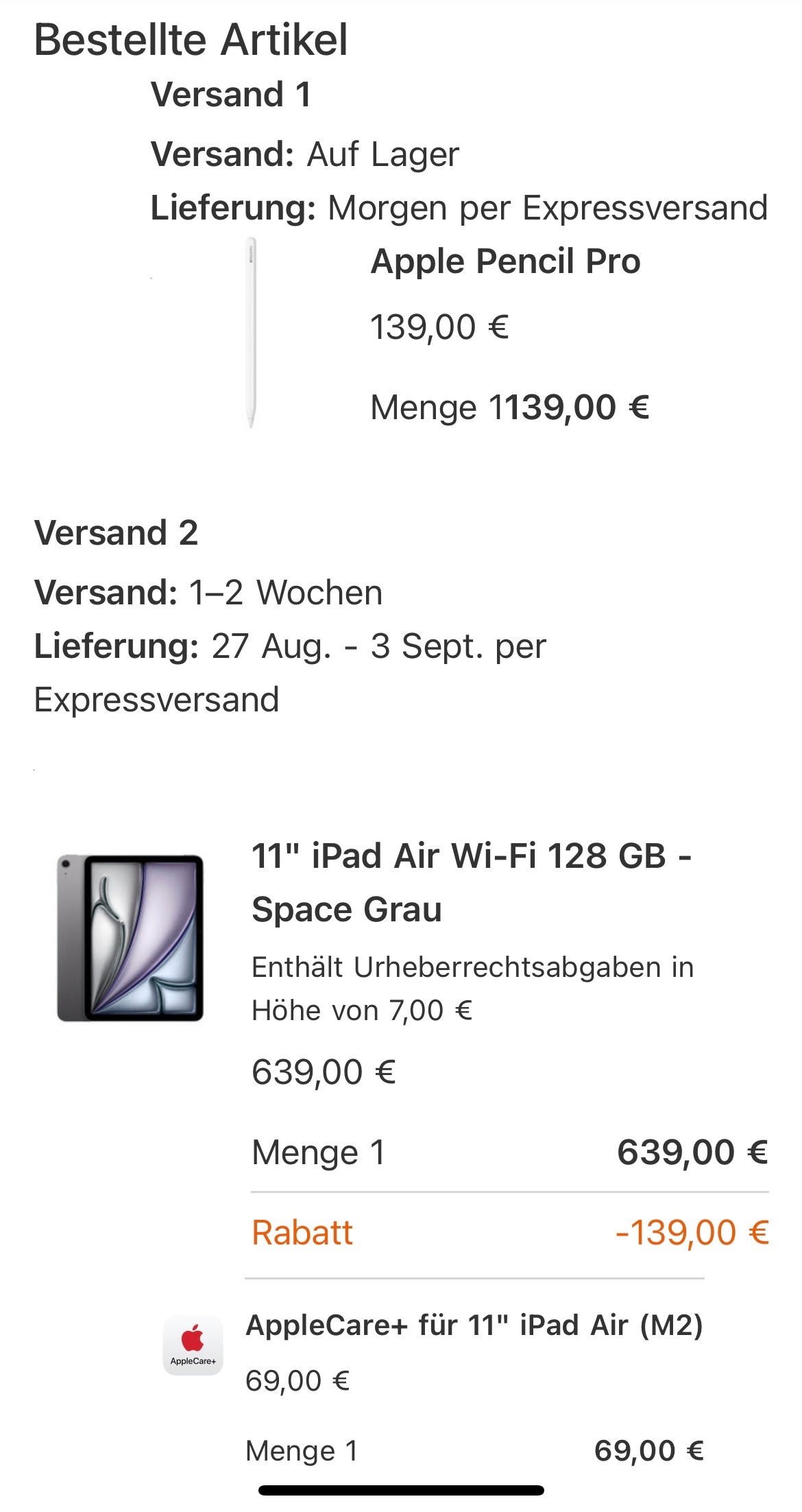 Hallo, ich habe mit bei Apple mit dem Bildungsrabatt ein iPad Air M2 11“ mit Apple Pencil und Apple care + gekauft . Der Gesamtbetrag war 708€. Den habe ich auch sofort bezahlt. Im Nachhinein wurde mir aber 139€ vom Konto abgebucht- anscheinend ist das der Preis für den Apple Pencil Pro den ich erworben habe.
