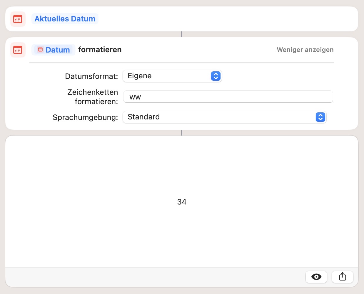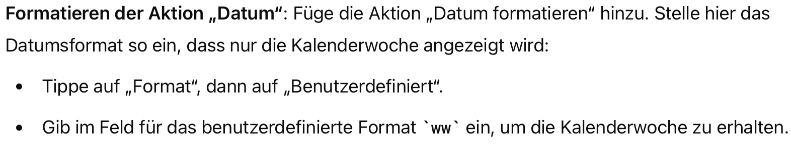 Hallo, wie kann ich mit der Kurzbefehle-App die aktuelle Kalenderwoche (KW) bestimmen? Die KW soll anschließend Teil eines Dateinamens werden. Wenn ich die KW über eine Abfrage manuell vorgebe, funktioniert es. Würde das aber gerne weiter automatisieren. Vielen Dank im Voraus!