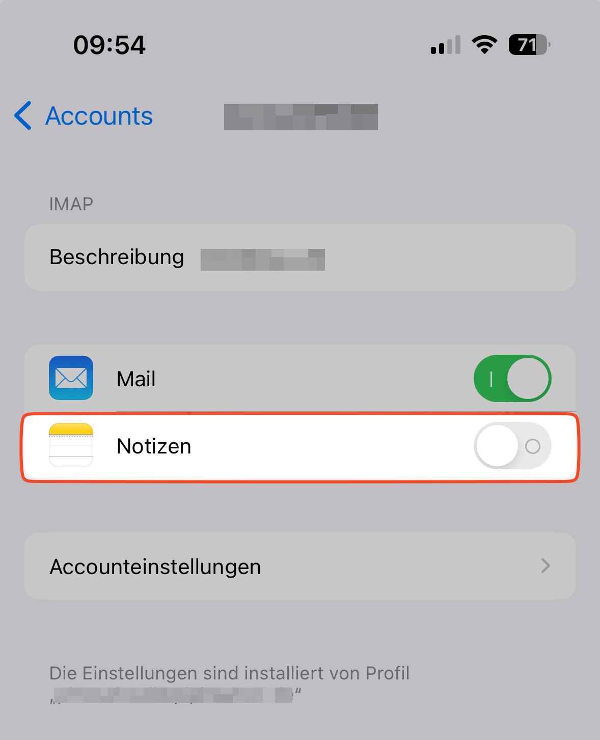 Da Du erwähnt hast, dass Deine Notizen mit einem Mail-Konto synchronisiert sind, gehe in die Einstellungen > Mail > Accounts und wähle Dein Konto aus. Stelle sicher, dass der Schalter für „Notizen“ aktiviert ist. Du könntest auch versuchen, das Konto vorübergehend zu deaktivieren und dann wieder zu aktivieren.