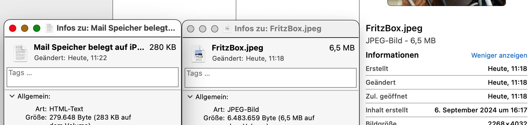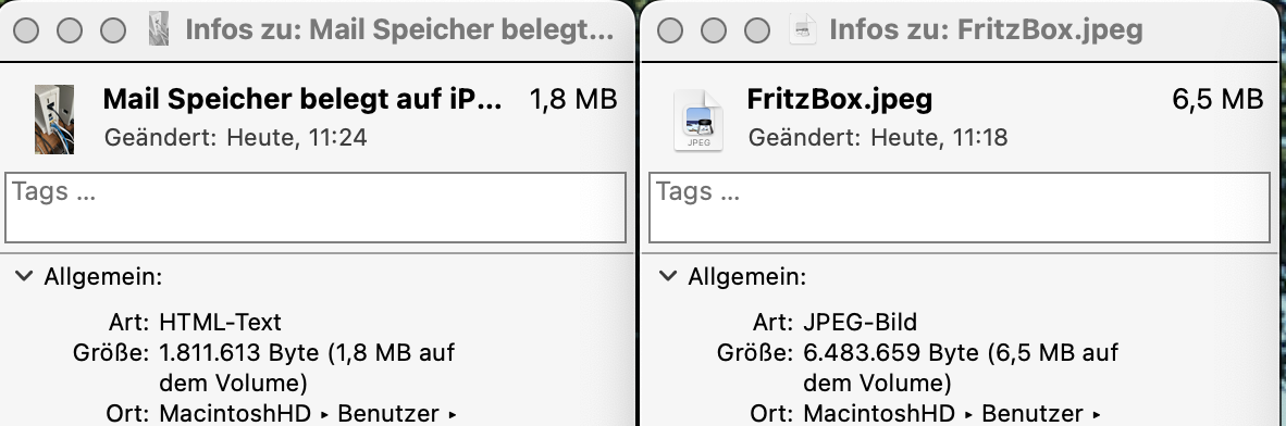 ich habe diese Seite in einem Finderordner auf meinem MacBook Pro gespeichert, ebenso ein Foto, bei beiden Dateien habe ich mit "CMD+i" die Informationen aufgerufen,