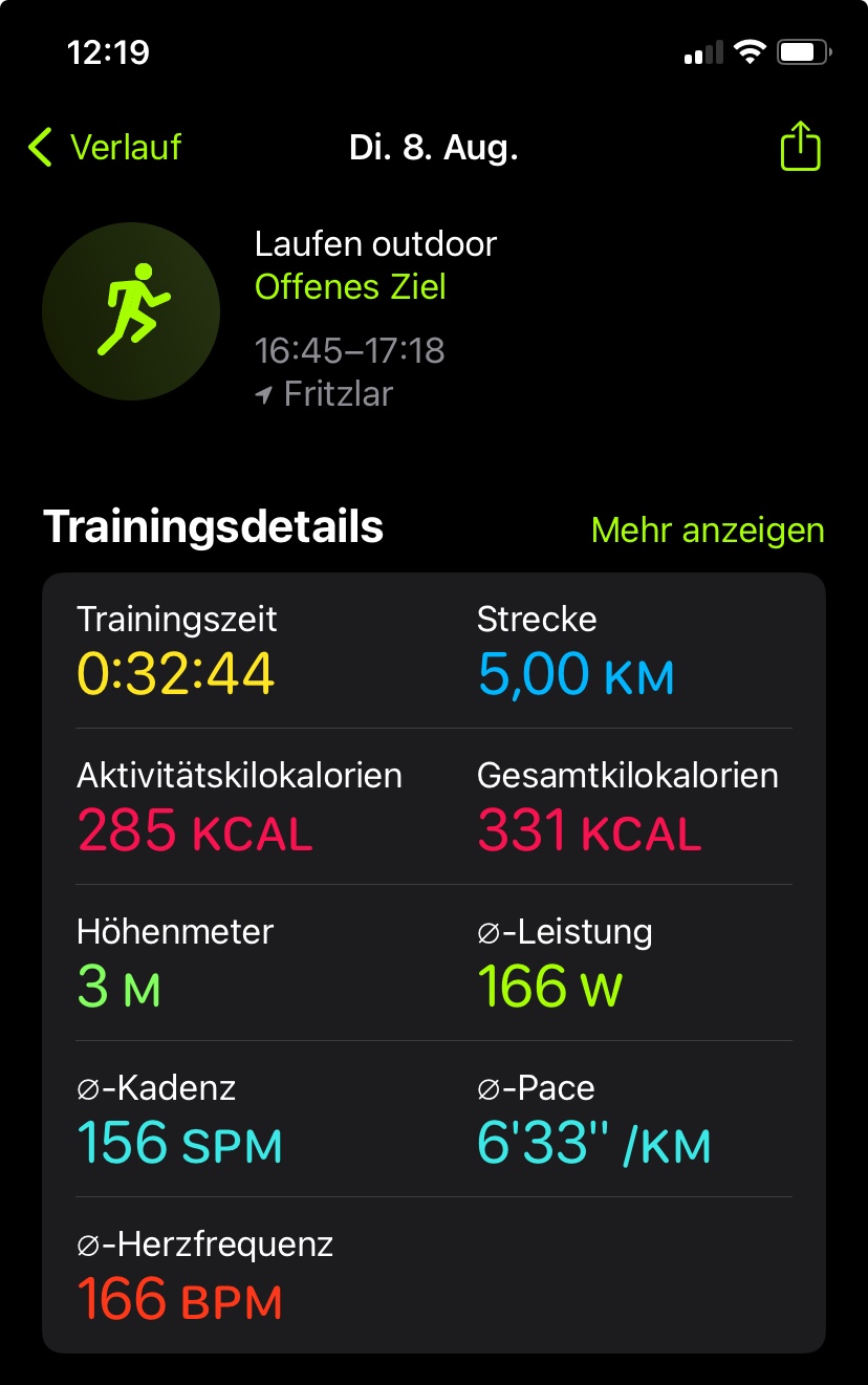 Ich vermute in diesem Fall allerdings, dass dein eigentlich neue Bestzeit (23.08.) höher angesetzt ist, als das sie dir in der Fitness App angezeigt wird. Daher ist die verstrichene Zeit auch höher als die Trainingszeit.