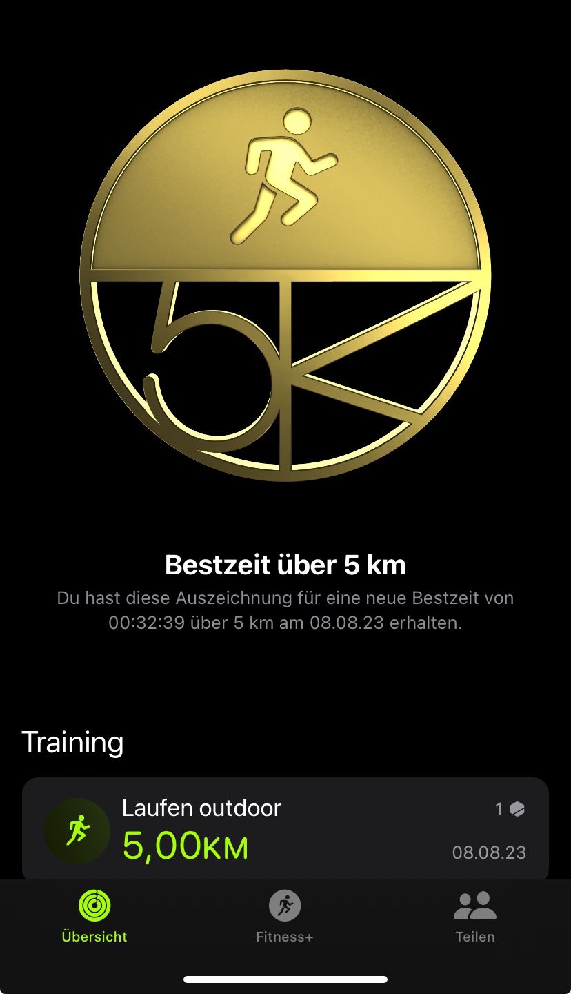 Wie du siehst kann man hier ebenfalls eine Diskrepanz erkennen. In der Medaille ist eine Zeit von 00:32:39 hinterlegt, während du im Training (vom 08.08.) eigentlich 00:32:44 gebraucht hast. Das passiert, weil die Zeiten teilweise gerundet werden.