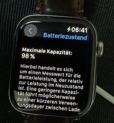 Akkuzustand bei meiner Apple Watch 7 Edelstahl 45mm ging in ein paar Tagen, von 98% auf 92%. Habe die gebraucht gekauft, am 21.8 waren es 98%, heute sind es nur noch 92%,
