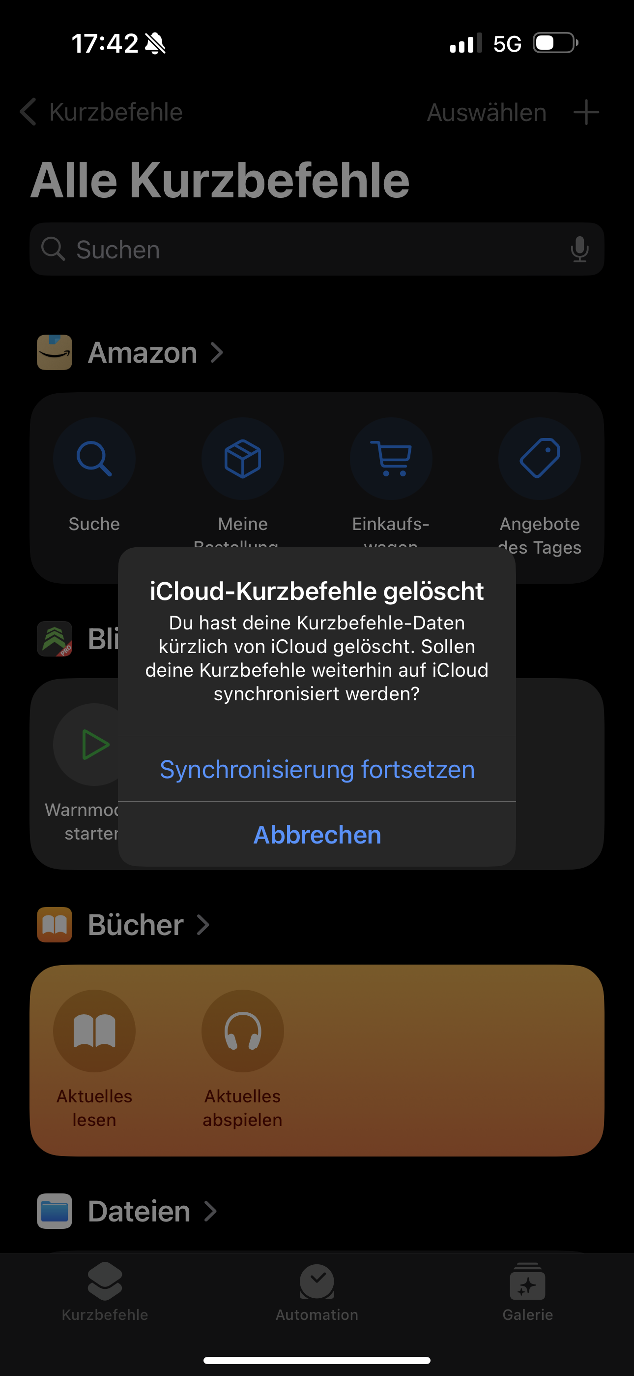 es kommt immer die Fehlermeldung: iCloud-Kurzbefehle gelöscht (Sync. fortsetzen / Abbrechen). Die Fehlermeldung kommt immer wenn die Kurzbefehle App in den Vordergrund geholt/neu gestartet wird.