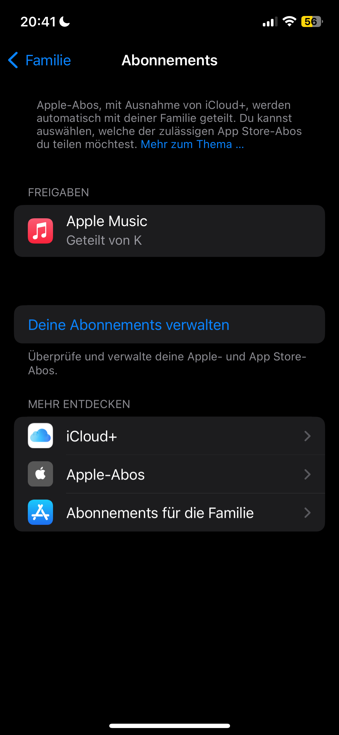Dass ich Apple Music teile sieht man bei den Abos auf dem iPhone meiner Tochter.