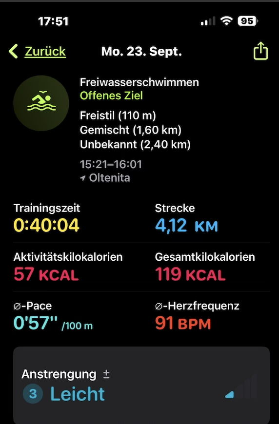 Das sind dann beispielsweise 14 m obwohl ich 40 Minuten geschwommen bin. Diese 14 m wurden in den ersten 2 Minuten aufgezeichnet. Danach kam nichts dazu. Die Kalorienanzahl und die Zeit wird aber normal weiter berechnet. Beim Beckenschwimmen tritt dieses Problem nicht auf.