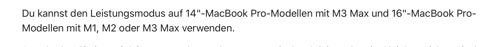 Tatsächlich steht der Hochleistungsmodus nur den 16-Zoll-Modellen des MacBook Pro mit M1 Max, M2 Max und M3 Max Chips zur Verfügung. Dein 14-Zoll MacBook Pro mit M2 Max Chip unterstützt diese Funktion daher nicht.