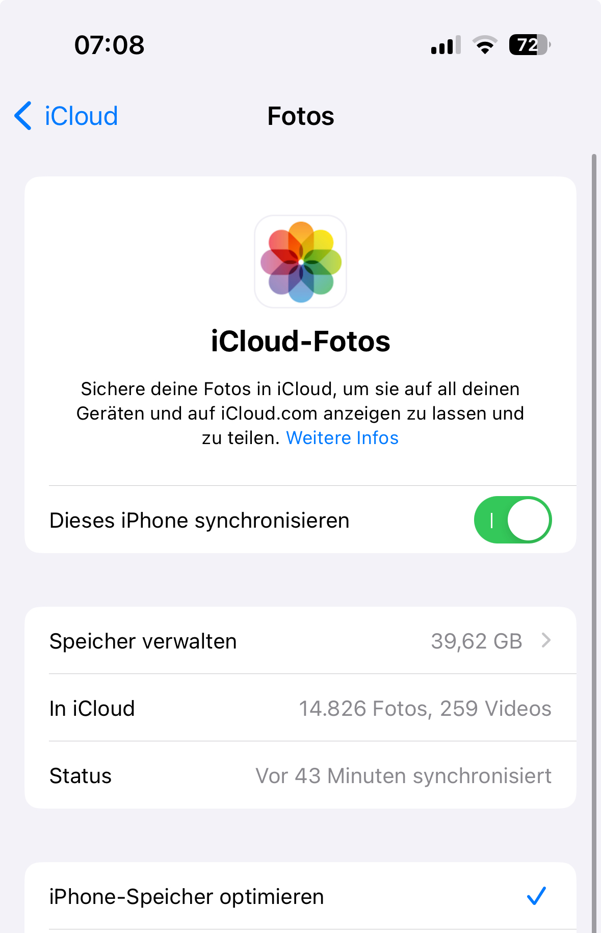 Wenn alle Fotos in die iCloud hochgeladen wurden, kontrolliere dann den belegten Speicherplatz auf deinem Gerät (Gerätespeicher). Die Speicherplatzbelegung sollte, wenn iPhone-Speicher optimieren aktiviert ist, um ein vielfaches geringer ausfallen, als die Belegung in der iCloud.