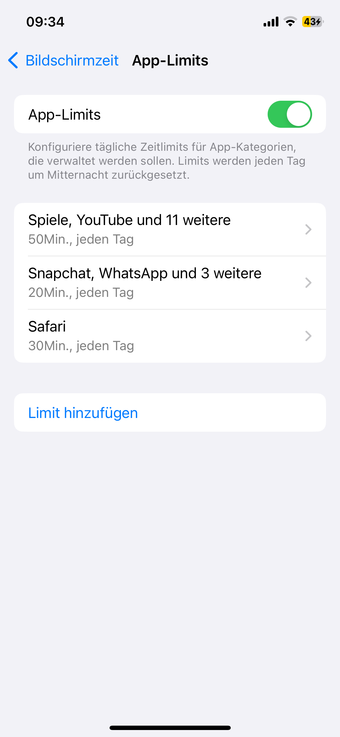 Ich hab ein paar Zeitlimits für mache Apps aber diese funktionieren anscheinend nicht.