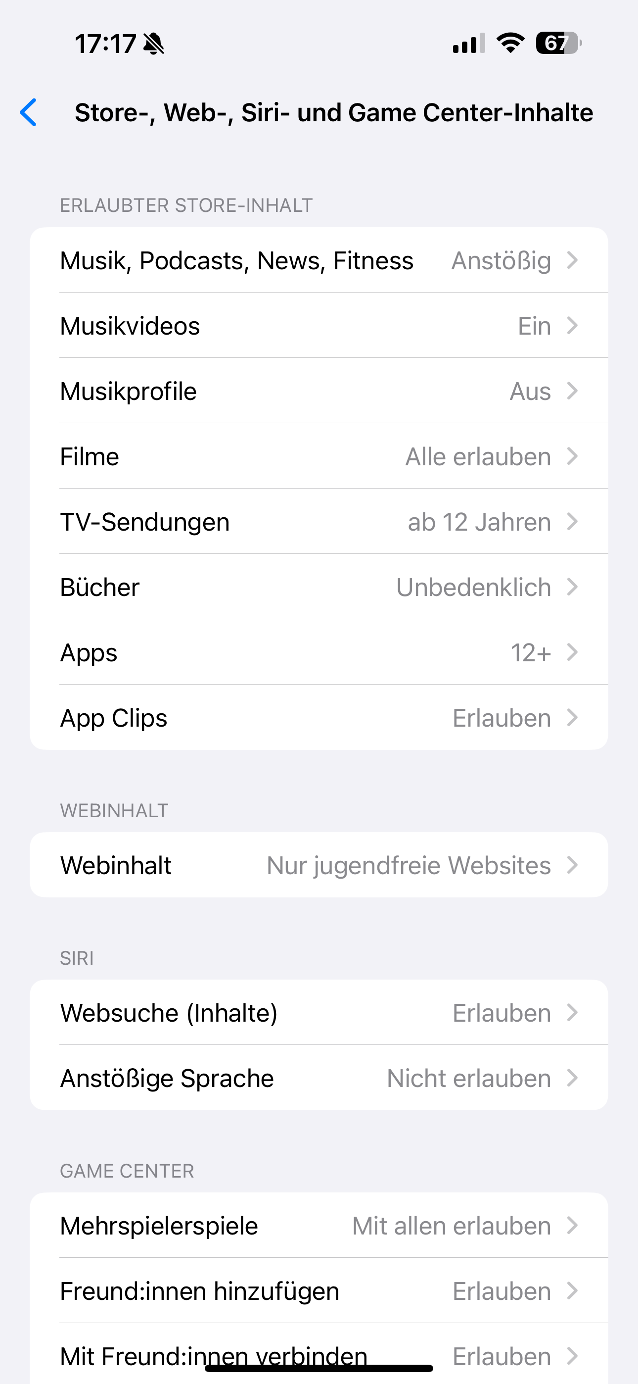 Man kann diese Optionen oder Alter nicht ändern, er lässt es nicht zu. Auf dem iPhone sieht das schon wieder anders aus, außer bei den Musikprofile. Da ist es ausgegraut. Achso auch die Alterseinstellungen lassen sich hier nicht wie oben ab 6+ nicht ändern. Keine Ahnung ob es damit was zur tun hat.