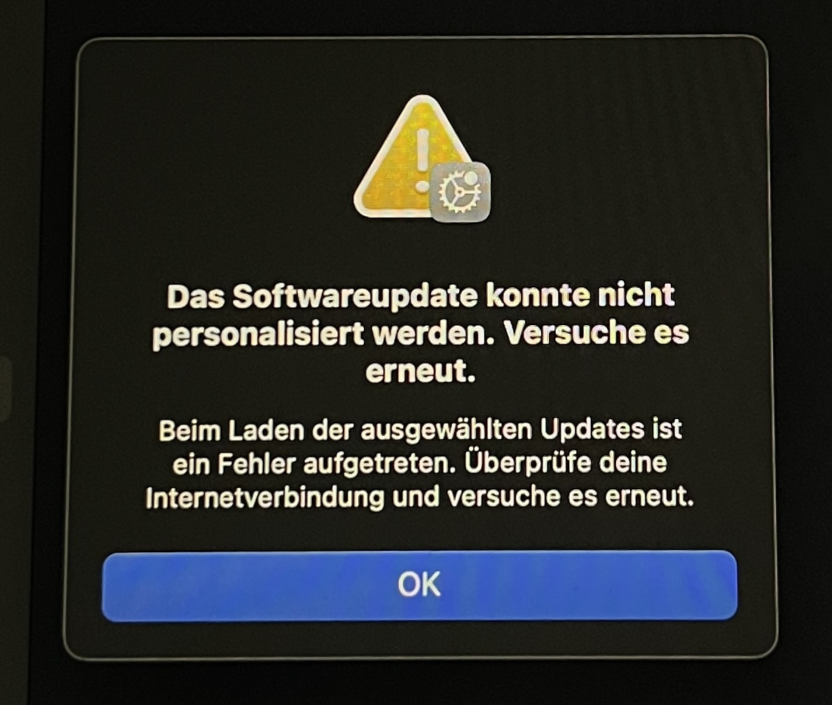 Wenn ich Dich richtig verstanden habe, hast Du Schwierigkeiten bei der Installation von macOS 15.0, weil bei dem Versuch, das Update zu installieren, die Fehlermeldung „Das Softwareupdate konnte nicht personalisiert werden“ erscheint. Du hast bereits mehrere Versuche unternommen und den Mac neu gestartet, aber das Problem bleibt bestehen.
