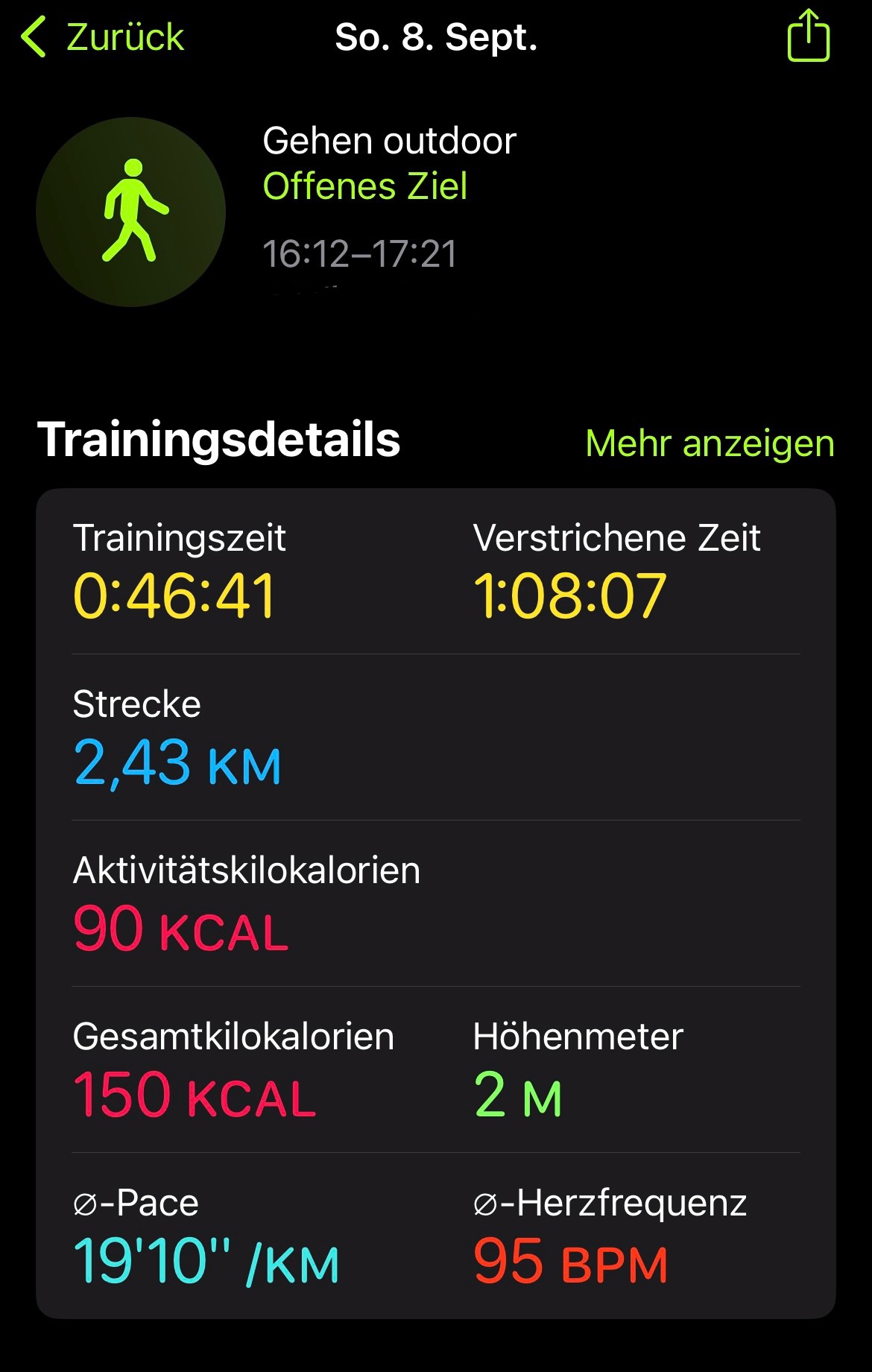 - Öffne die Trainings-App, und tippe dann auf „Gehen outdoor“ oder auf „Laufen outdoor“. Um vor dem Start ein Ziel festzulegen, tippe auf die Taste „Mehr“