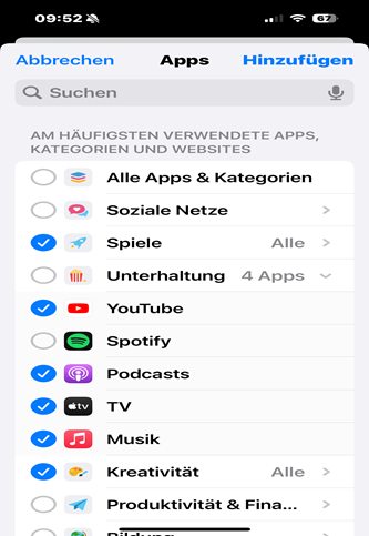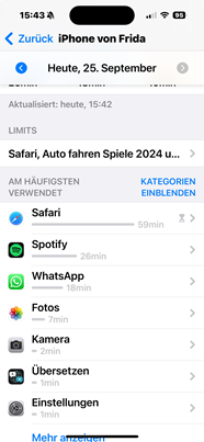 - ein paar Apps, wie z.B. Spotify, Fotos, Wetter etc. soll sie den ganzen Tag uneingeschränkt immer nutzen können. Hierzu direkt die Frage, wenn ich z.B. bei den App-Limits für alle Apps eine Stunde angebe, wird trotzdem von den vorher genannten Apps Spotify, Fotos, Wetter etc. die den ganzen Tag uneingeschränkt genutzt werden dürfen, diese Zeit bei Nutzung mit von diesem einstündigen Limit abgezogen. Kann man das umgehen? Ich möchte halt die Stunde App-Limits nur für alle anderen Apps gelten lassen, die nicht uneingeschränkt genutzt werden können.