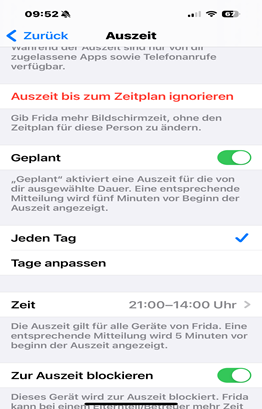 - Gleichzeitig möchte ich aber auch eine Auszeit festlegen, d.h in der Zeit von z.b. 21 Uhr abends bis 14 Uhr Mittags soll diese Auszeit gelten. In dieser Auszeit dürfen nur die Apps, die unter "Immer erlauben" aufgezählt sind genutzt werden. Und hier direkt mein nächstes Problem. Ich verstehe die folgenden Hinweise nicht: