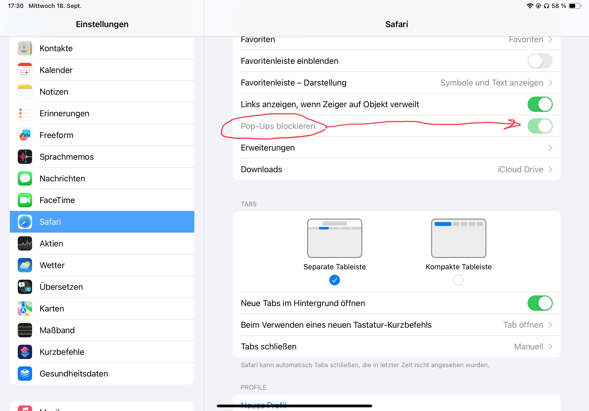 iPad Pro - Pop-Up Einstellung lässt sich nicht ändern