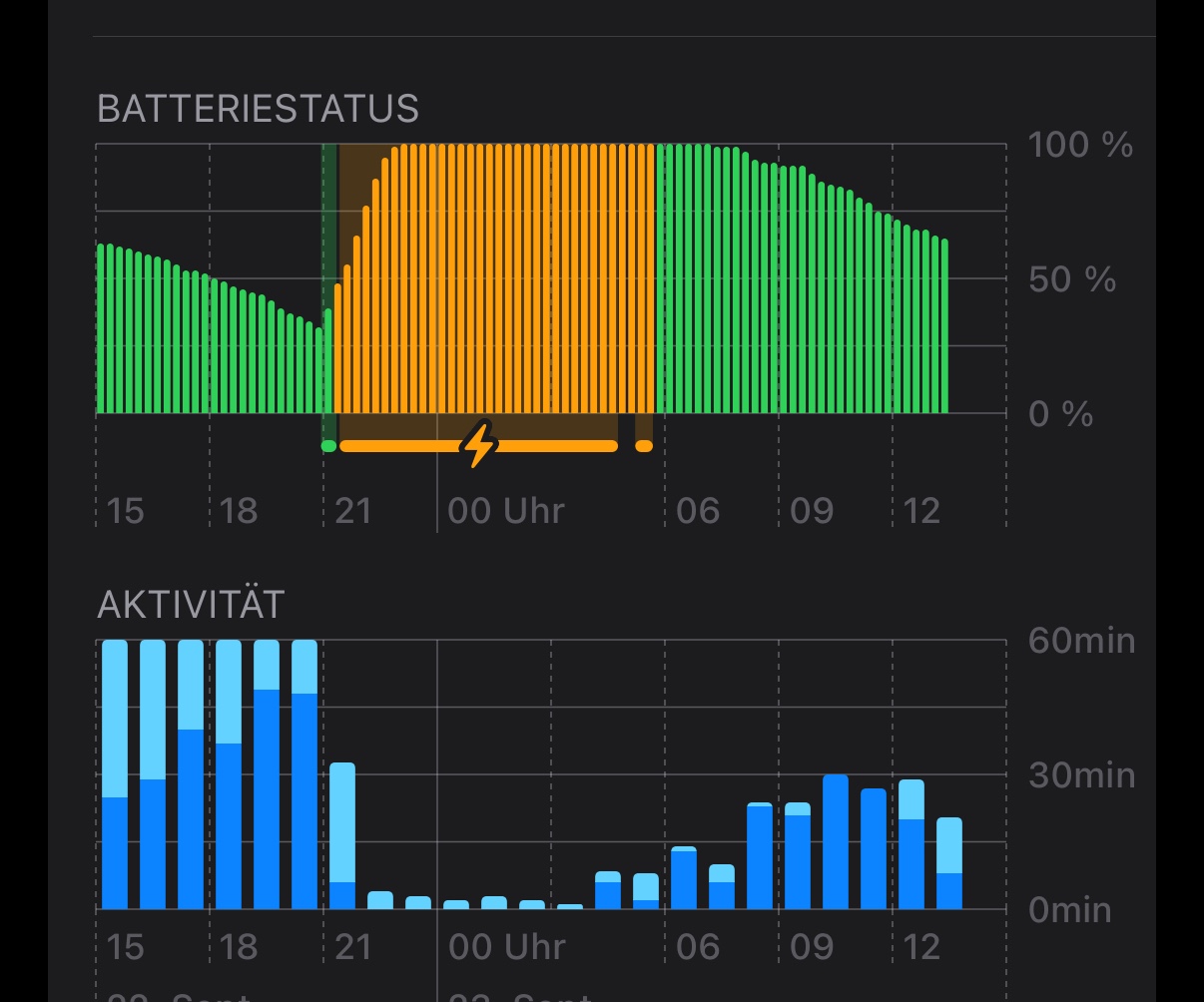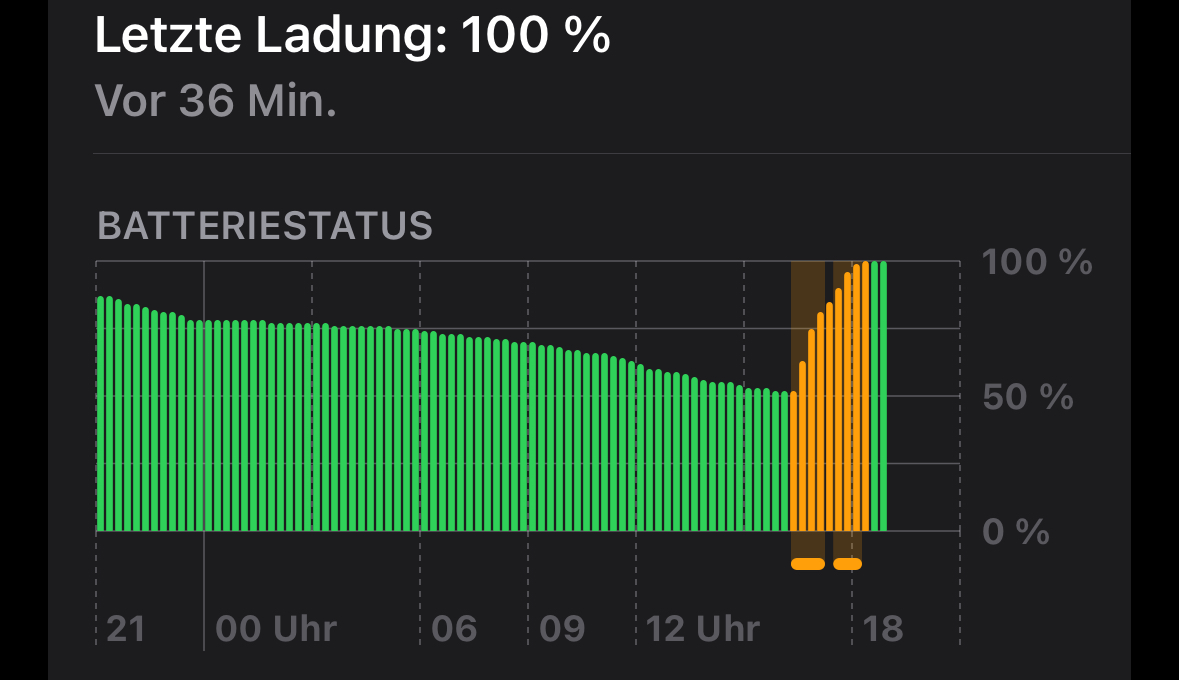 die Ladegeschwindigkeit kannst du ja ungefähr an den „Grünen, horizontalen Balken“ unter dem Graphen ablesen/„errechnen“ (bei dir aktuell nicht zu sehen)…Wofür die orangenen, vertikalen Balken sind, ist mir leider auch noch nicht ganz schlüssig geworden. Ich würde mal behaupten, dass das mit der „Bildschirm ein“-Leistung oder dem allgemeinen „hohen“ Akku-Verbrauch zu der Zeit zusammenhängt - da sehe ich zumindest bei mir Parallelen.