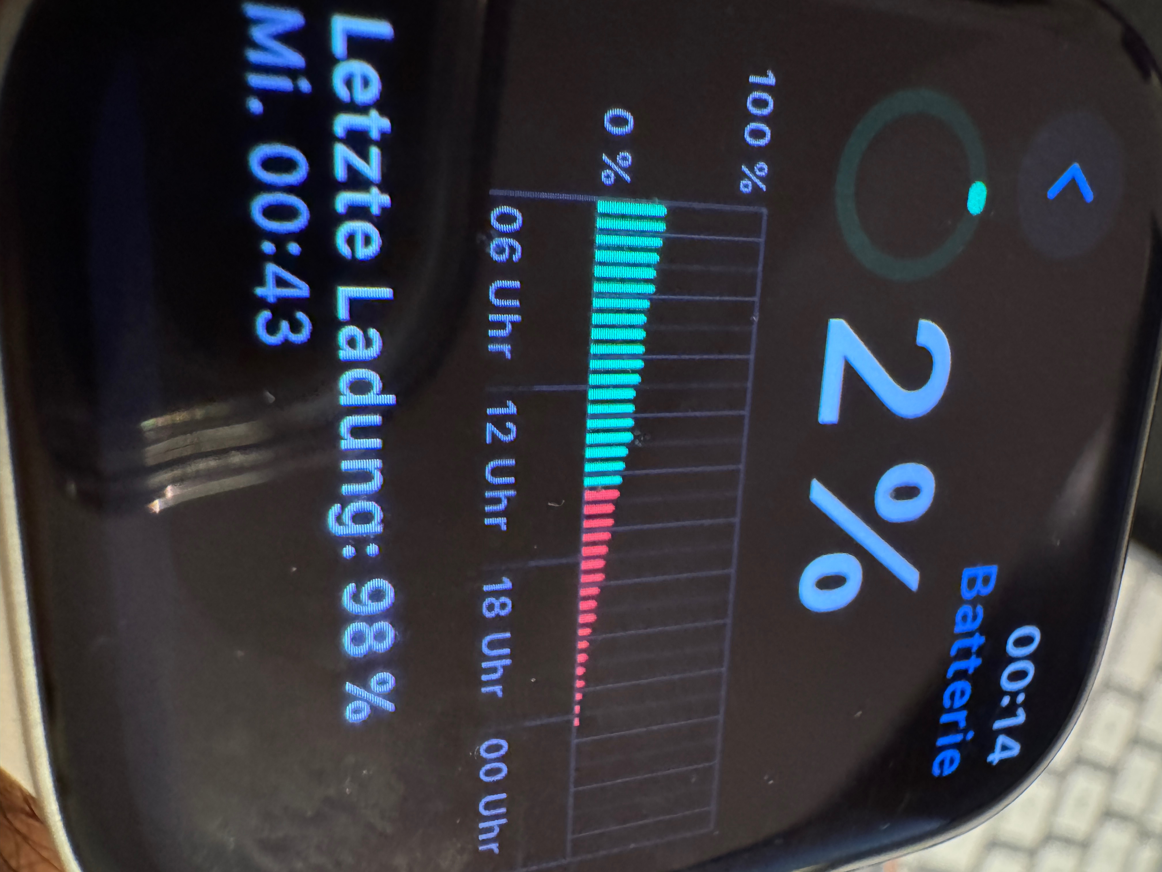 Bisher hielt eine Ladung ca. 2 Tage. Sprich bspw. Montag Morgen nehme ich sie vom Ladegerät und Dienstag Abend packe ich sie wieder auf das Ladegerät. Seit OS 11 allerdings muss ich sie jeden Abend laden da sie nur noch zwischen 20 - 30% an Ladung hat. Ist gerade blöd weil so Sachen wie das neue Schlaf Apnoe Feature nur funktioniert wenn es mehrere Nächte trackt. Aber das ist bei mir ja gar nicht möglich. Dazu kommt dass in der Grafik der Nutzung keine Nutzung sichtbar ist (s. Screenshot) und die letzte 100% Ladung angeblich letzte Woche Dienstag am 10.09.2024 gewesen sein soll. Naja ich nehm sie jeden morgen mit 100% vom Ladegerät also stimmt das schonmal nicht.