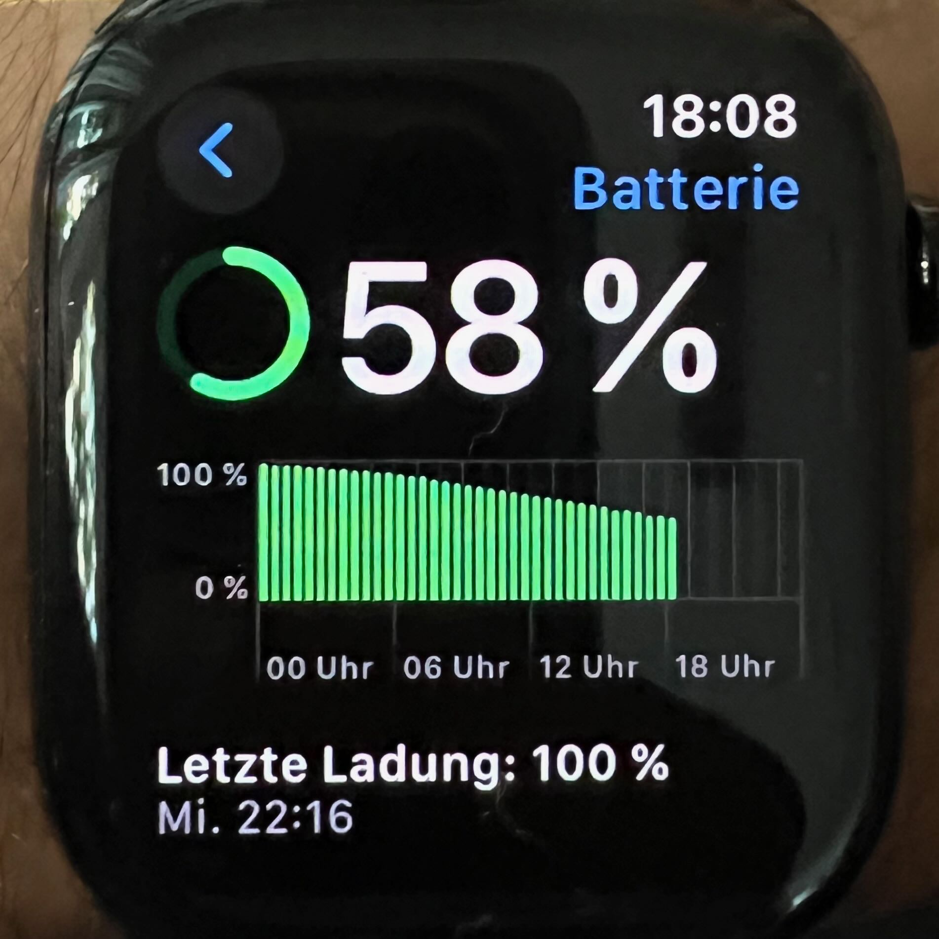 Mir geht es mit meiner Series 7 auch so. Während ich vor dem Update locker über 2 Tage gekommen bin, schaffe ich seit dem Update auf WatchOS11.3 nur gerade so einen Tag. Letzte Ladung letzte Nacht um 1:30Uhr (hatte Spätdienst bis 24Uhr) Akkustand jetzt um 9:50Uhr nach dem Aufstehen ist bei 78%. Gestern als ich an die Arbeit bin um 14Uhr hatte ich noch 53% und zum Feierabend um 24Uhr war sie dann aus.