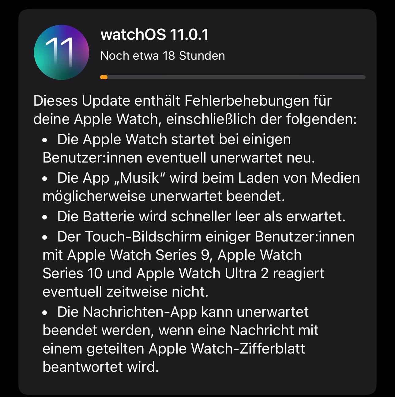 Bei WatchOS 10 war das allerdings auch so und wurde seitens Apple mit 10.1 recht schnell gefixt. Danach waren die Probleme bei mir verschwunden und die Batterie hielt wieder lockere 2+ Tage.