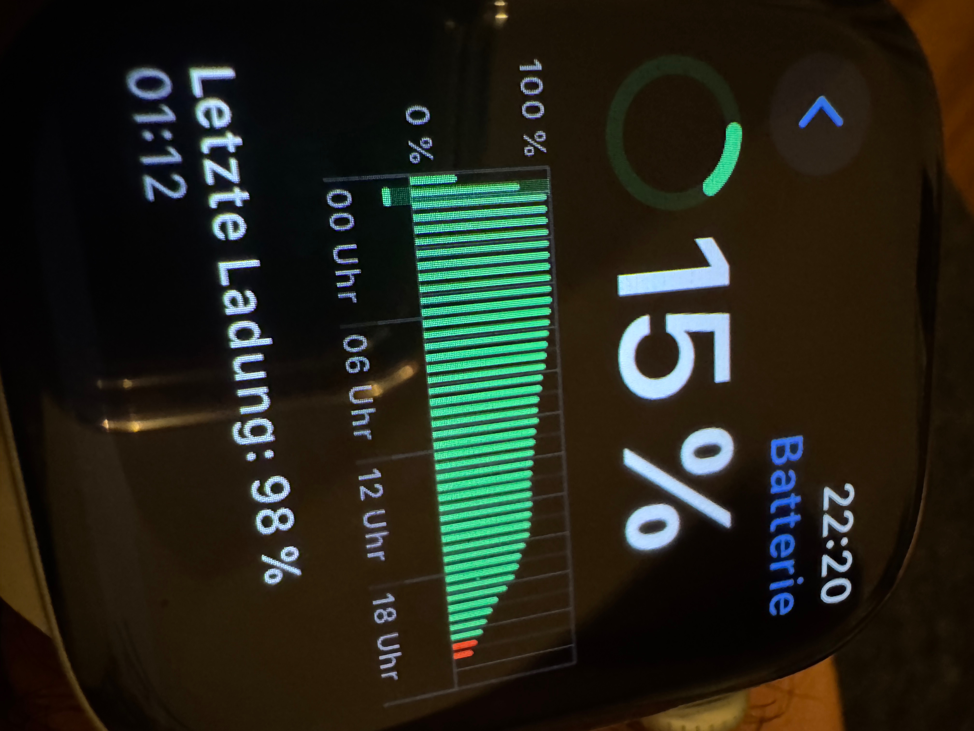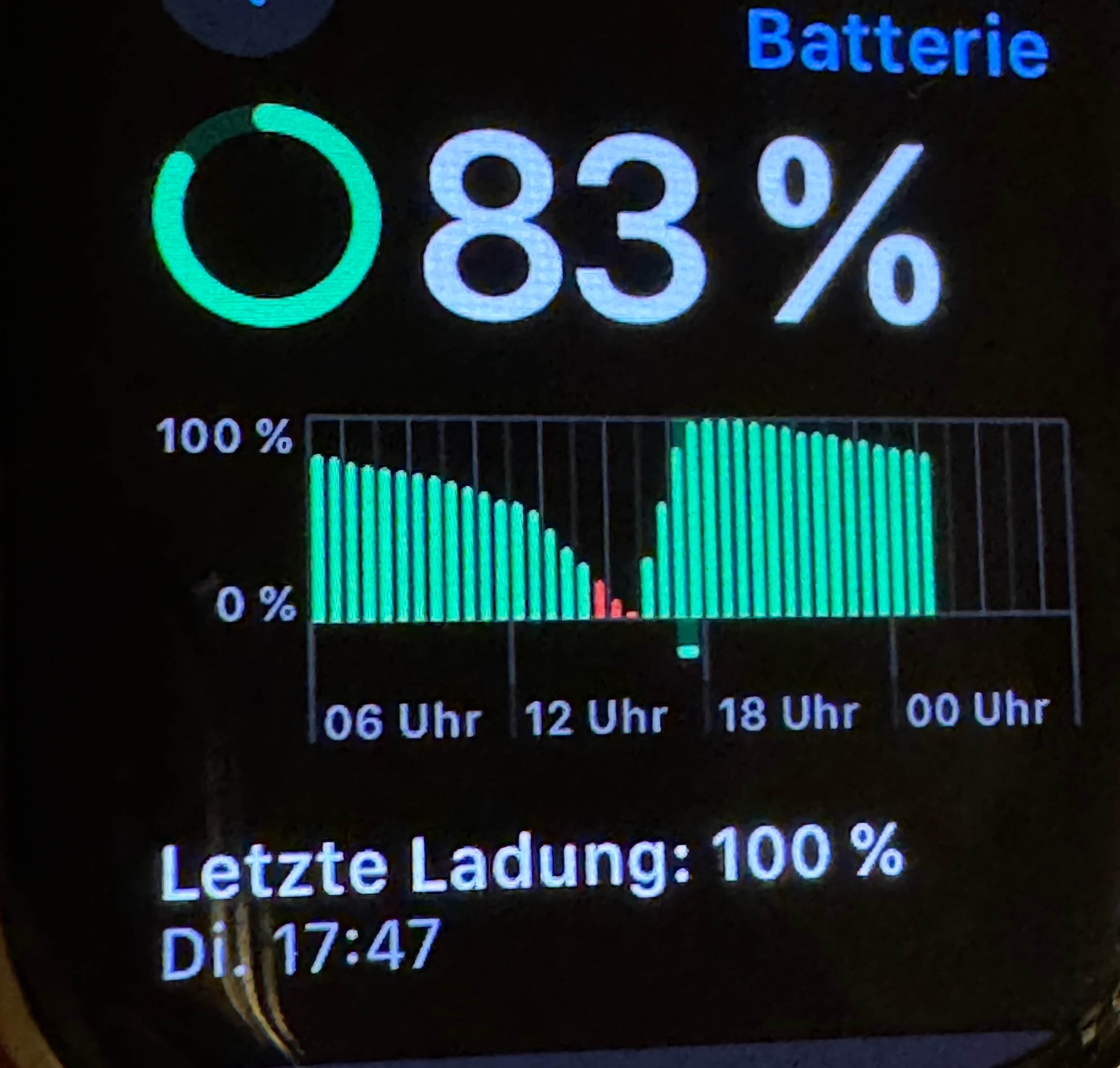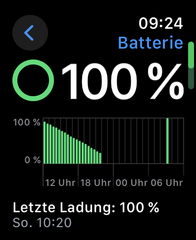 Bisher hielt eine Ladung ca. 2 Tage. Sprich bspw. Montag Morgen nehme ich sie vom Ladegerät und Dienstag Abend packe ich sie wieder auf das Ladegerät. Seit OS 11 allerdings muss ich sie jeden Abend laden da sie nur noch zwischen 20 - 30% an Ladung hat. Ist gerade blöd weil so Sachen wie das neue Schlaf Apnoe Feature nur funktioniert wenn es mehrere Nächte trackt. Aber das ist bei mir ja gar nicht möglich. Dazu kommt dass in der Grafik der Nutzung keine Nutzung sichtbar ist (s. Screenshot) und die letzte 100% Ladung angeblich letzte Woche Dienstag am 10.09.2024 gewesen sein soll. Naja ich nehm sie jeden morgen mit 100% vom Ladegerät also stimmt das schonmal nicht.